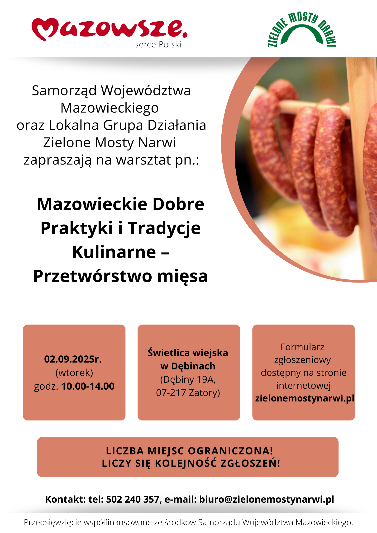 Samorząd Województwa Mazowieckiego oraz Lokalna Grupa Działania Zielone Mosty Narwi zaprasza do udziału w warsztatach pn. "Mazowieckie Dobre Praktyki Kulinarne - przetwórstwo mięsa".