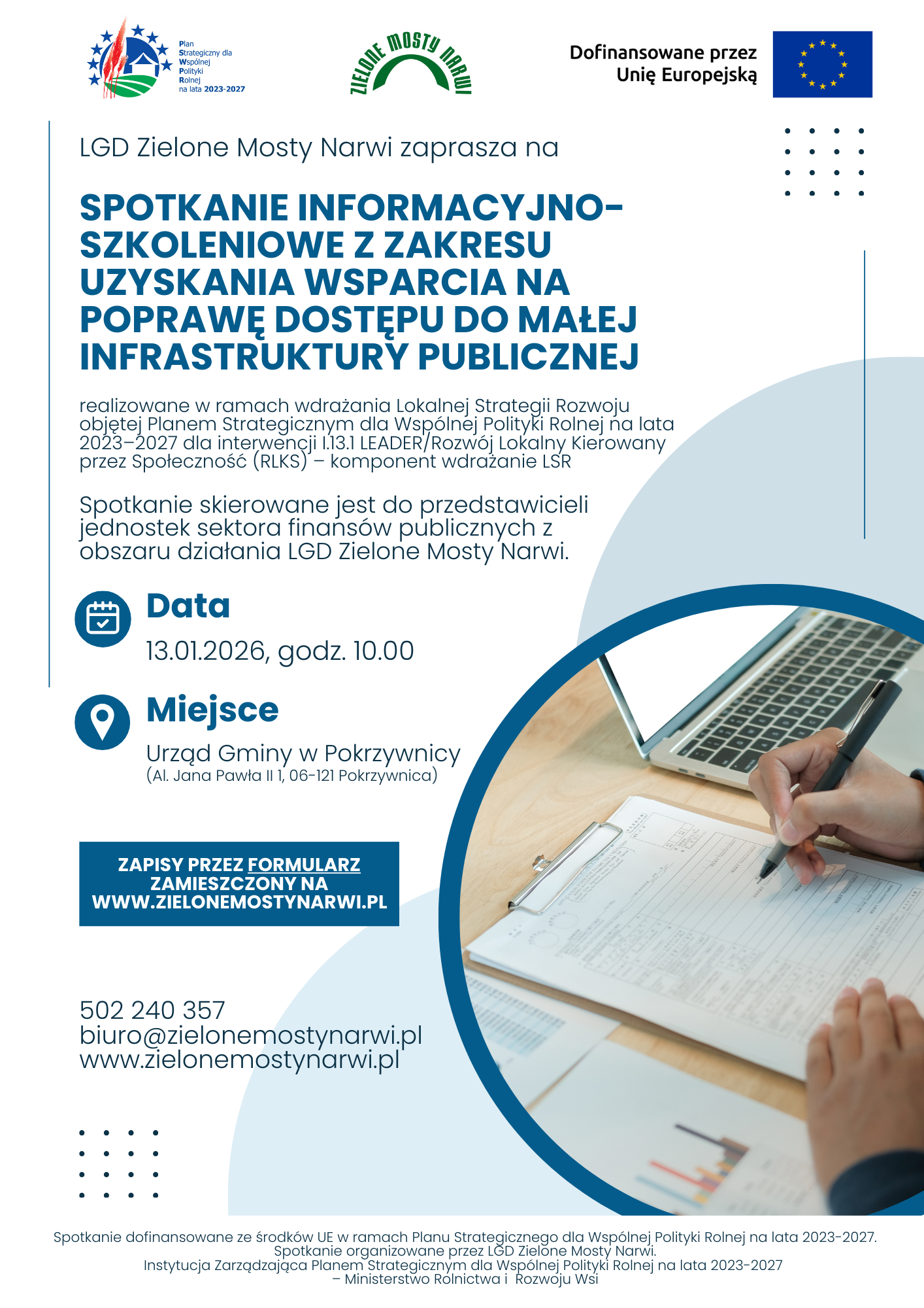 LGD Zielone Mosty Narwi zaprasza na spotkanie informacyjno-szkoleniowe o możliwościach wsparcia z zakresu „poprawa dostępu do małej infrastruktury publicznej” w ramach wdrażania Lokalnej Strategii Rozwoju realizowanej przez stowarzyszenie LGD Zielone Mosty Narwi w ramach Planu Strategicznego dla Wspólnej Polityki Rolnej na lata 2023–2027 dla interwencji I.13.1 LEADER/Rozwój Lokalny Kierowany przez Społeczność (RLKS) – komponent wdrażanie LSR.