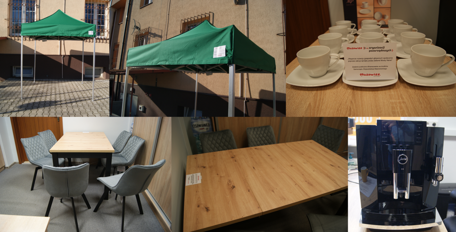 Dofinansowanie w kwocie 10 000zł zostało przeznaczone na zakup ekspresu do kawy, filiżanek, stołu, krzeseł i namiotu, które będą służyły organizacji spotkań i aktywizacji mieszkanek obszaru Zielone Mosty Narwi!