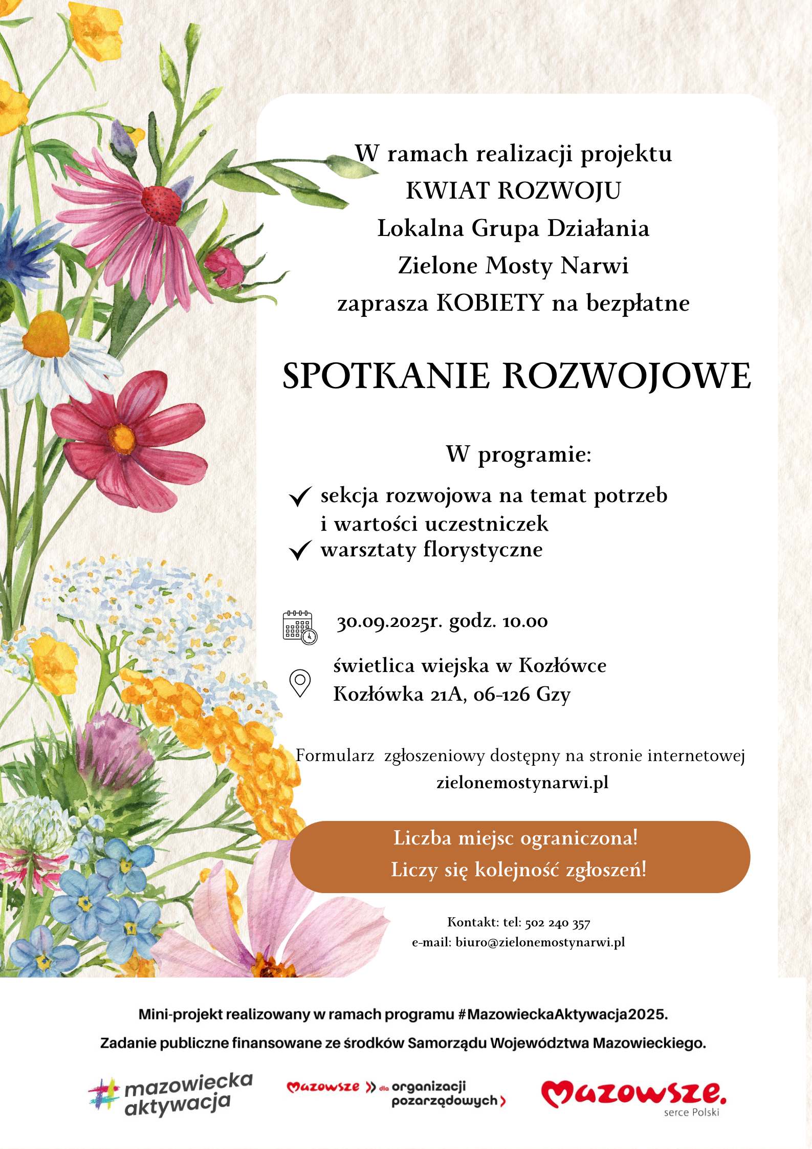 Zapraszamy do udziału spotkaniu rozwojowym dla kobiet (sekcja rozwojowa + warsztaty florystyczne) w ramach realizacji projektu: "Kwiat rozwoju" w ramach konkursu #MazowieckaAktywacja.