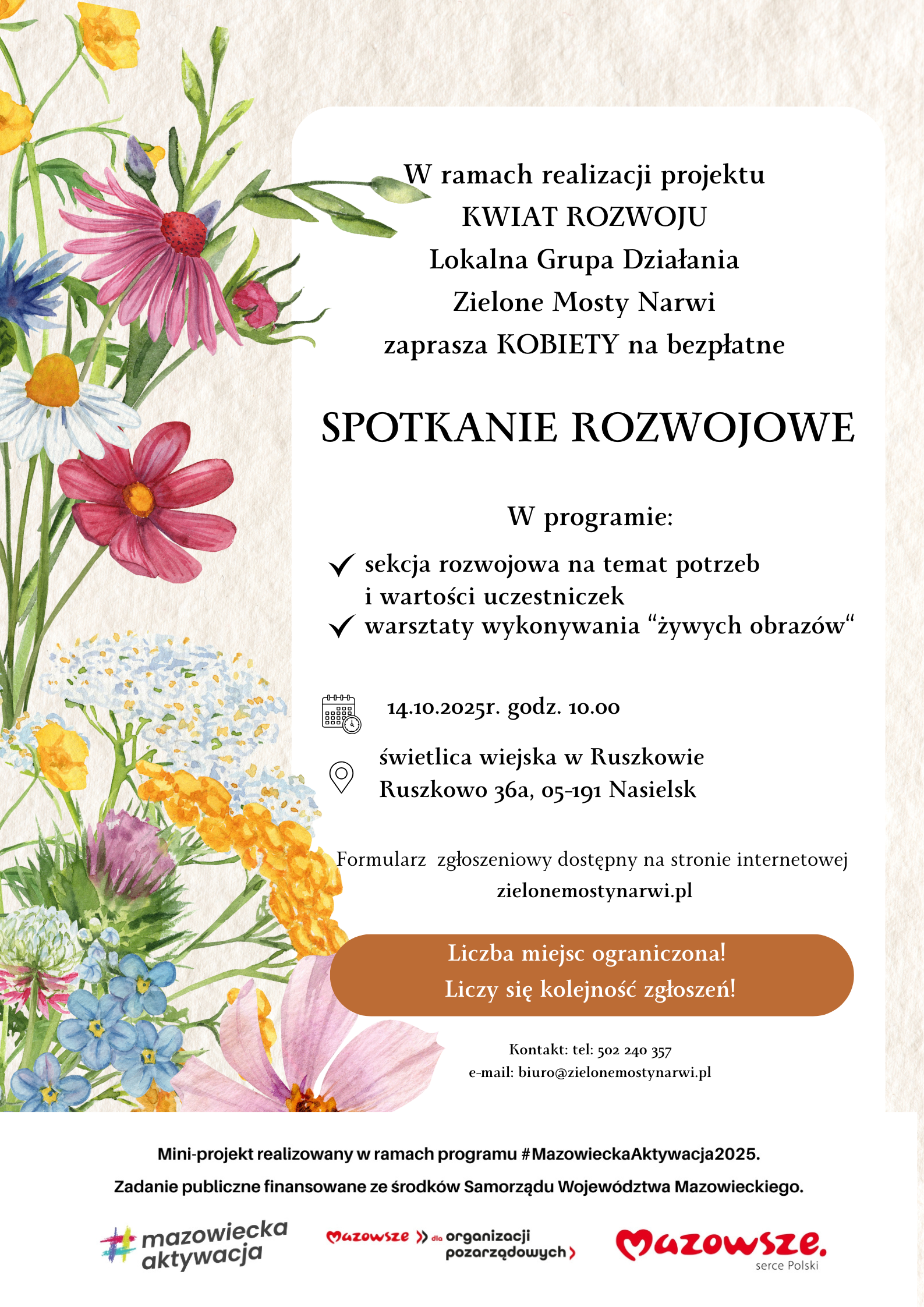Zapraszamy do udziału spotkaniu rozwojowym dla kobiet (sekcja rozwojowa + warsztaty tworzenia "żywych obrazów") w ramach realizacji projektu: "Kwiat rozwoju" w ramach konkursu #MazowieckaAktywacja.